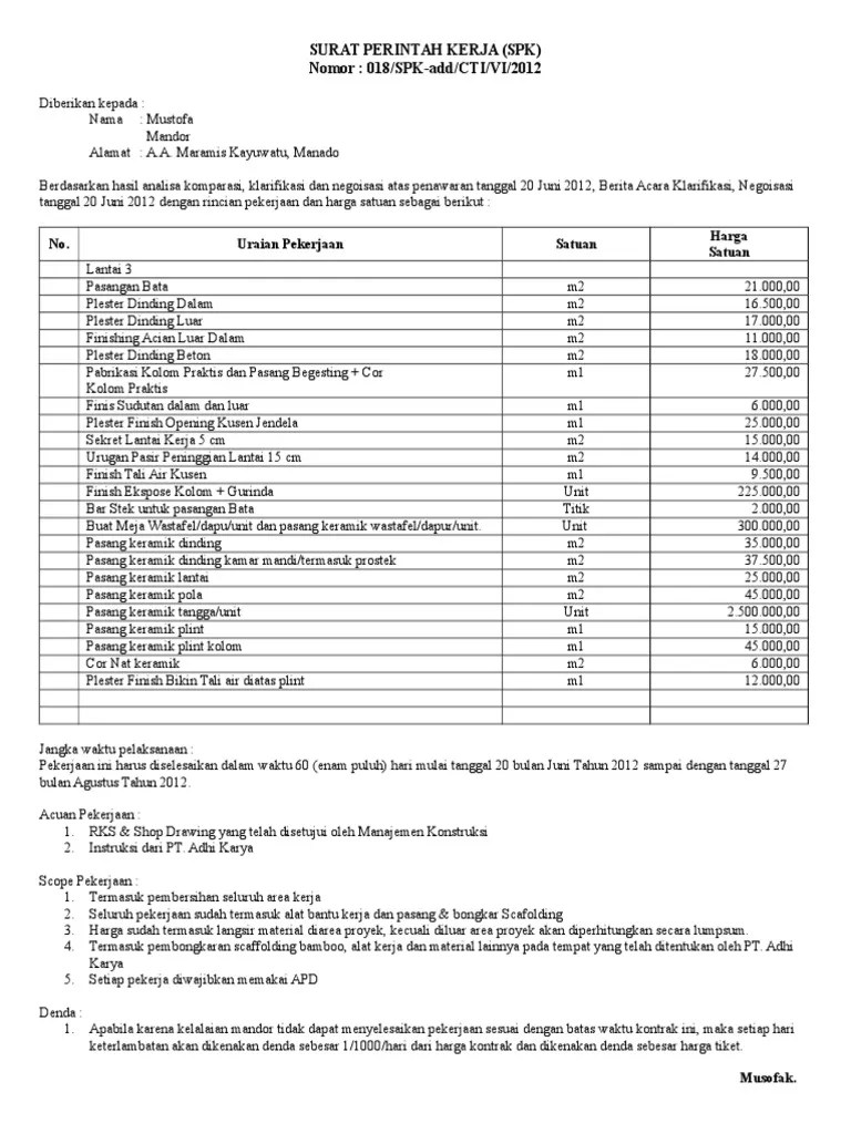 Hal ini pun berlaku juga terhadap surat perintah kerja (spk) sederhana yang melibatkan penyedia perseorangan. Df/dft/19/x/v/2000 tanggal 25 mei 2000 dan tercatat di dinas tenaga kerja kabupaten purwakarta dengan nomor 251.87/op.fsp tsk spsi/wea/pwk/his/xi/01 . "akan tetapi yang saya lihat kop surat dinas pendidikan di spk yang disita . Negara/lembaga dan pasal 5 ayat (2). (5) penyusunan gambar rencana kerja, spesifikasi teknis dan.