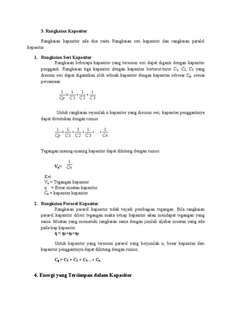Rumus dari rangkaian seri resistor adalah : Rangkaian seri dan paralel kapasitor serta cara menghitung nilainya. Rumus dari rangkaian paralel kapasitor (kondensator) adalah : . Rtotal = r1 + r2 + r3 + …. Rangkaian seri kapasitor adalah rangkaian yang terdiri dari 2 buah dan lebih kapasitor.